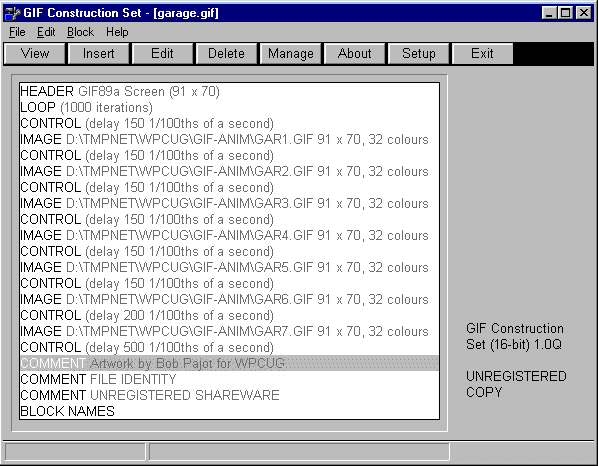GIF Construction Set is a great little program to work with. It is very intuitively designed and has excellent help available at the touch of a button. If a help button is not available for what you are working on at the time just hit F1 and there it is, HELP on exactly what you are doing.